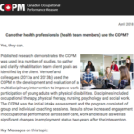 April 2018 COPM Newsletter April 30, 2018UncategorizedCindy DeCola Can other health professionals (health team members) use the COPM? – Find out more in the April 2018 newsletter!